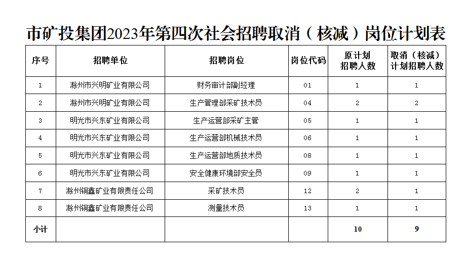 根據(jù)《滁州市興滁礦業(yè)投資集團(tuán)有限公司2023年第四次社會(huì)招聘公告》規(guī)定,經(jīng)對各崗位報(bào)名情況篩查審定,結(jié)合資格復(fù)審情況,部分崗位報(bào)名情況未達(dá)到開考比例,經(jīng)研究決定取消(核減)以下崗位招聘計(jì)劃: