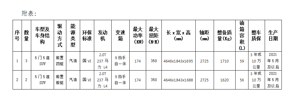 根據(jù)業(yè)務發(fā)展需要,滁州市興元商貿(mào)有限公司擬集中采購業(yè)務保障車輛共計5輛,詳情見附表。